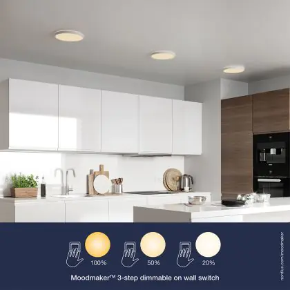 Questa plafoniera Oja di Nordlux dimostra chiaramente che è possibile adattare la luce. Questo apparecchio è dotato di una funzione Moodmaker a tre livelli, che può essere regolata premendo un interruttore. In questo modo si ottengono 3 modalità di illuminazione: