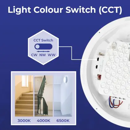 Per scegliere un apparecchio di illuminazione bisogna anche considerare dove verrà installato. Per esempio la luce di 2700 Kelvin (bianco molto caldo) e 3000 Kelvin (bianco caldo) creano un’atmosfera rilassante e piacevole. Questa tonalità è quindi molto adatta ad ambienti accoglienti o a zone generiche come corridoi, ascensori, disimpegni o pianerottoli. Una luce di 4000 Kelvin (bianco freddo), invece,è più luminosa e fresca ed è quindi adatta come illuminazione funzionale in uffici, aziende, scuole e biblioteche. La temperatura di colore di questa plafoniera LED è 3000K - 4000K - 6500K CCT.