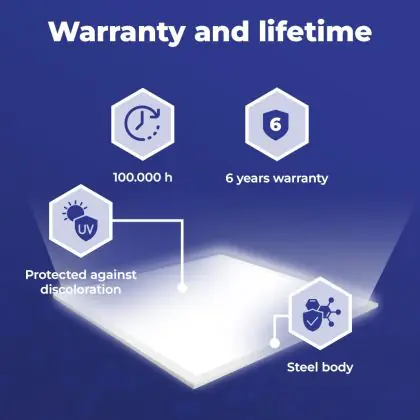 Questo pannello LED ha un ciclo di vita di 100000 ore, che vuol dire che funzionerà in modo ottimale per diversi anni. Questo ti permetterà di risparmiare sui costi di manutenzione e sostituzione! Inoltre, questo pannello LED è protetto da una garanzia di 5 anni. Infine, l'illuminazione LED permette di ridurre le emissioni di CO2 e, non contenendo sostanze tossiche, i LED possono essere riciclati.