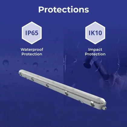 Questo apparecchio può essere usato sia in spazi interni che in spazi esterni, poiché ha indice di protezione contro l'ingresso di acqua e polvere IP65. In generale, un apparecchio con IP44 è resistente a schizzi di acqua e umidità, e può quindi essere installato in spazi esterni molto umidi o esterni riparati, come sono una tettoia. Un apparecchio che invece verrà esposto a intensi getti di acqua deve avere almeno IP54. Questa lampada ha anche un indice di resistenza a urti e impatti di IK10 - 20 Joule