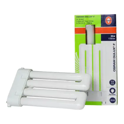 Le Osram Dulux F 24W/840 sono lampade a basso consumo caratterizzate da una lunga vita utile. L'attacco di queste lampade fluorescenti compatte é del tipo ed é dotato di 4 pin (perni). La potenza di tali lampade é di 24W.